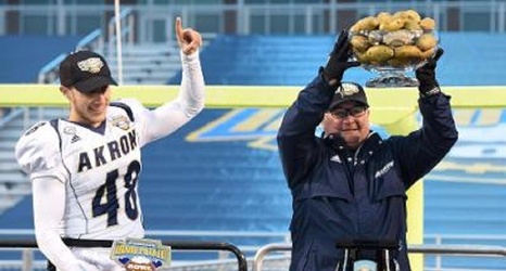 The University of Akron football team won their first FBS bowl game in the history of the program Tuesday afternoon by defeating the Utah State Aggies 23-21 in the Famous Idaho Potato Bowl game. The game was played at Albertsons Stadium in Boise, Idaho before 18,876 fans.