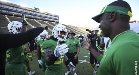 Originally scheduled to be a scrimmage, Sunday's Oregon football workout was instead a standard practice session. But the hundreds of season-ticket holders and Duck Athletic Fund supporters still were treated to a show.